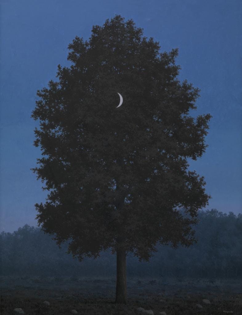 Een boom staat in een veld. De lucht is blauwgrijs, het gebladerte roerloos. Maar de maan hangt niet boven de boom, zoals de natuur eist – ze zweeft er pal voor, alsof iemand haar op het canvas heeft geprikt. Zestien september heet het doek, en het is het soort schilderij dat je eerst laat glimlachen en dan licht paranoïde maakt. Het is René Magritte op zijn best: kalm, precies, en licht pervers in zijn sereniteit. Zijn realisme is zo scherp dat je het spontaan begint te wantrouwen, terwijl de maan je aankijkt als een oog dat te veel weet. Alsof ze heeft gezien wat je gisteren na twaalven googelde. Je hoort de Belgische meestersurrealist fluisteren: ‘Alles wat we zien, verbergt iets anders.’ En je weet: hij liegt niet, zelfs al gaat hij serieel vreemd met de werkelijkheid.