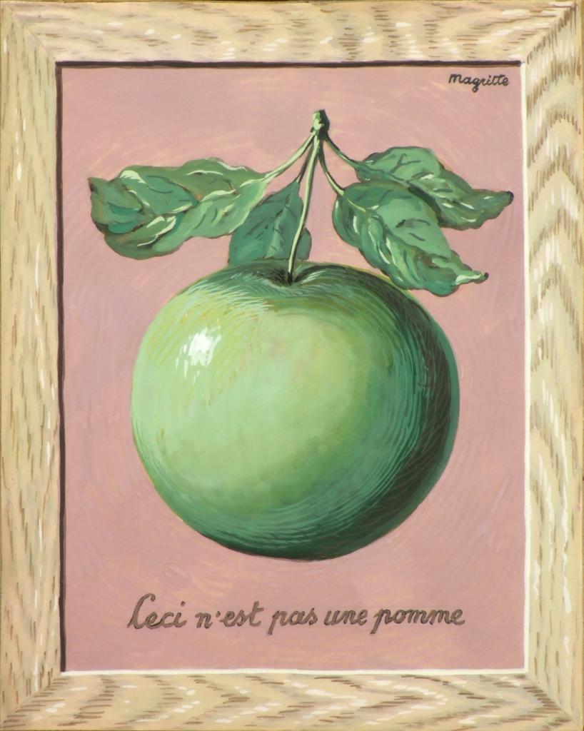De volgende zaal focust op Magrittes Parijse periode. Tussen 1927 en 1930 flirt hij met het Franse surrealisme, maar het is vooral een verstandshuwelijk: ze delen ideeën, maar slapen in aparte dromen. Het Franse surrealisme, onder leiding van André Breton, richt zich op het onderbewuste, op Freud, op spontane associaties. Het Belgische surrealisme is cerebraal, rationeel, bijna filosofisch. In 1929 schrijft Magritte een manifest over taal (Les mots et les images) waarin hij stelt: ‘Een woord kan in de werkelijkheid de plaats van een object innemen.’ Het resultaat: Ceci n’est pas une pipe, Ceci n’est pas une pomme. Wat je ziet, is niet wat je krijgt. Wat je krijgt, is een afbeelding van wat je ziet. De veiligheid van taal wordt onderuitgehaald, het beeld wordt een grap met een punchline.