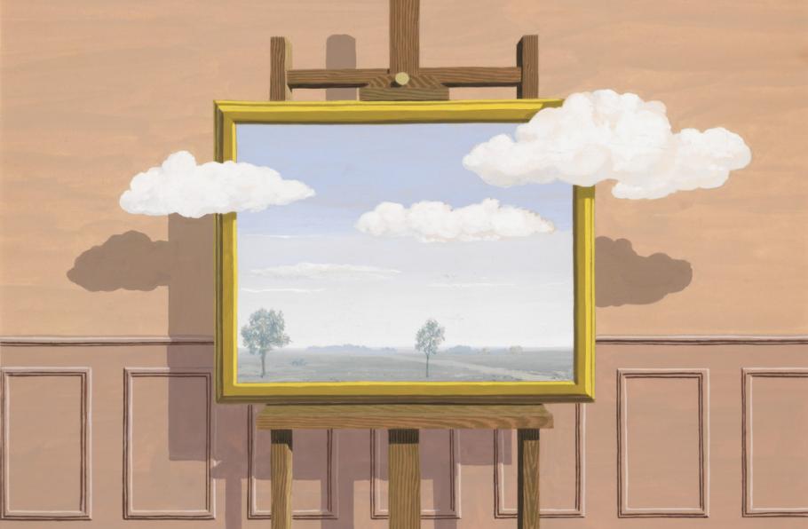 La vengeance (1938) toont een schilderij op een ezel, met wolken die uit het doek hangen en een schaduw werpen op de muur erachter. Magritte laat de afbeelding letterlijk uit haar kader breken. De wolken lijken zich te bevrijden, alsof ze hun eigen realiteit opeisen. Het tafereel oogt lieflijk, maar de titel – ‘de wraak’ – injecteert een onderhuidse dreiging. Wat wordt hier gewroken? Door wie? En waarom zo stilletjes? Zoals altijd bij Magritte is het niet het beeld dat schreeuwt, maar de gedachte die krast. De vertrouwde dingen zijn niet geruststellend, maar verdacht. ‘Te vaak reduceren we wat vreemd is tot wat vertrouwd is. Ik wil het vertrouwde terugbrengen naar het vreemde’, aldus Magritte. Missie geslaagd.