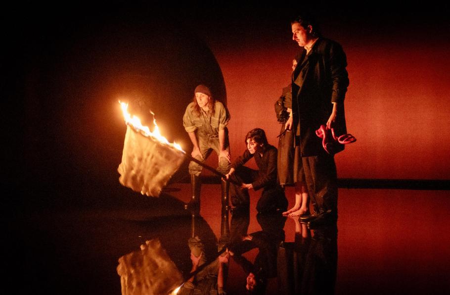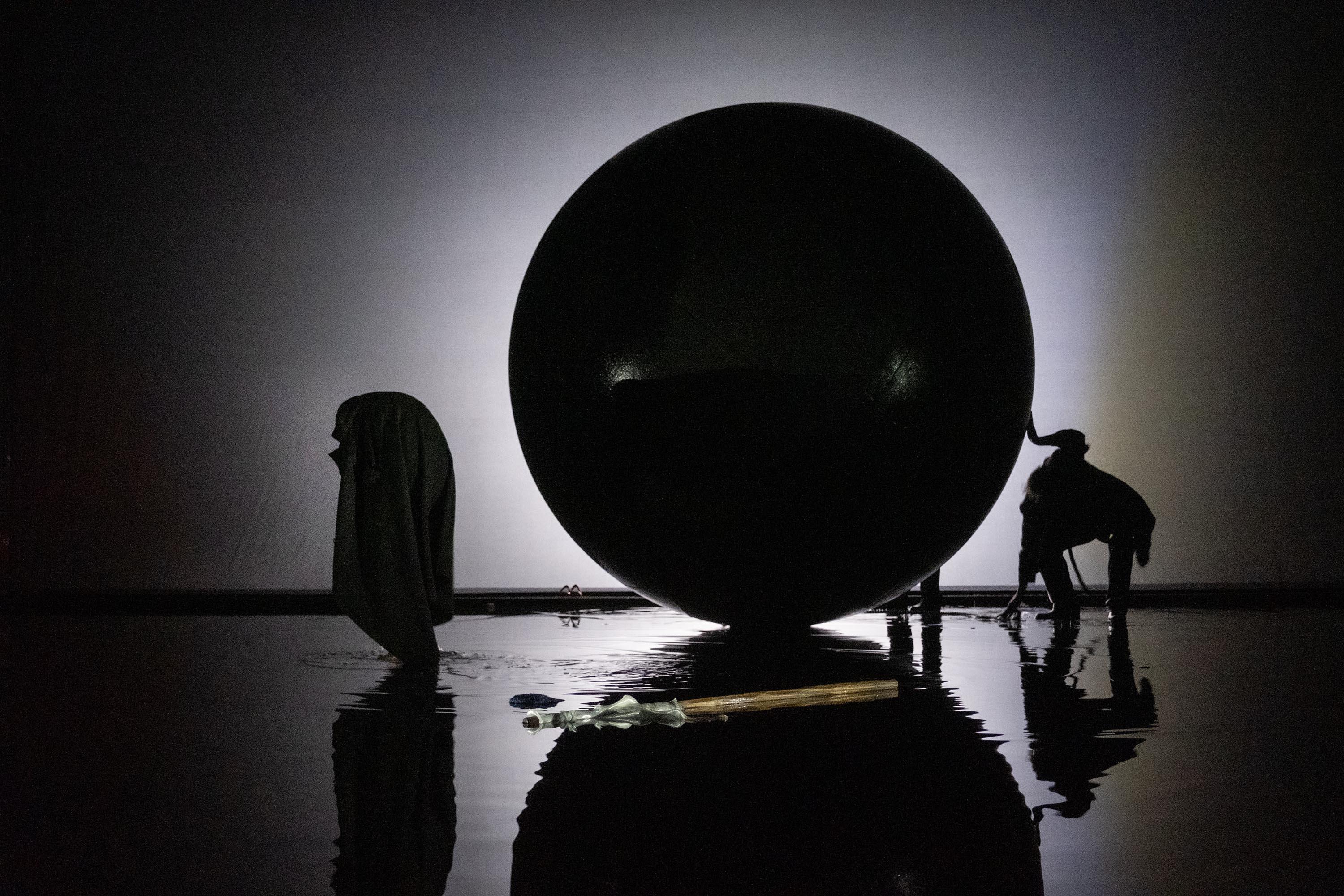 Lisaboa Houbrechts vertelde aan Knack Focus dat de tijd waarin we leven haast dwingt om de tanden te zetten in Moeder Courage, een anti-oorlogsstuk van Bertolt Brecht uit 1936 over een moeder die haar kar met koopwaar voortduwt – samen met haar kinderen – over het van bloed doordrongen oorlogsfront. Het resultaat oogt overweldigend mooi. Het podium staat onder water. Net zoals de wereld. En op dat water ligt een gigantische grijze bol – diameter: drie meter – die voortdurend ondersteund moet worden door een of meerdere van de spelers.