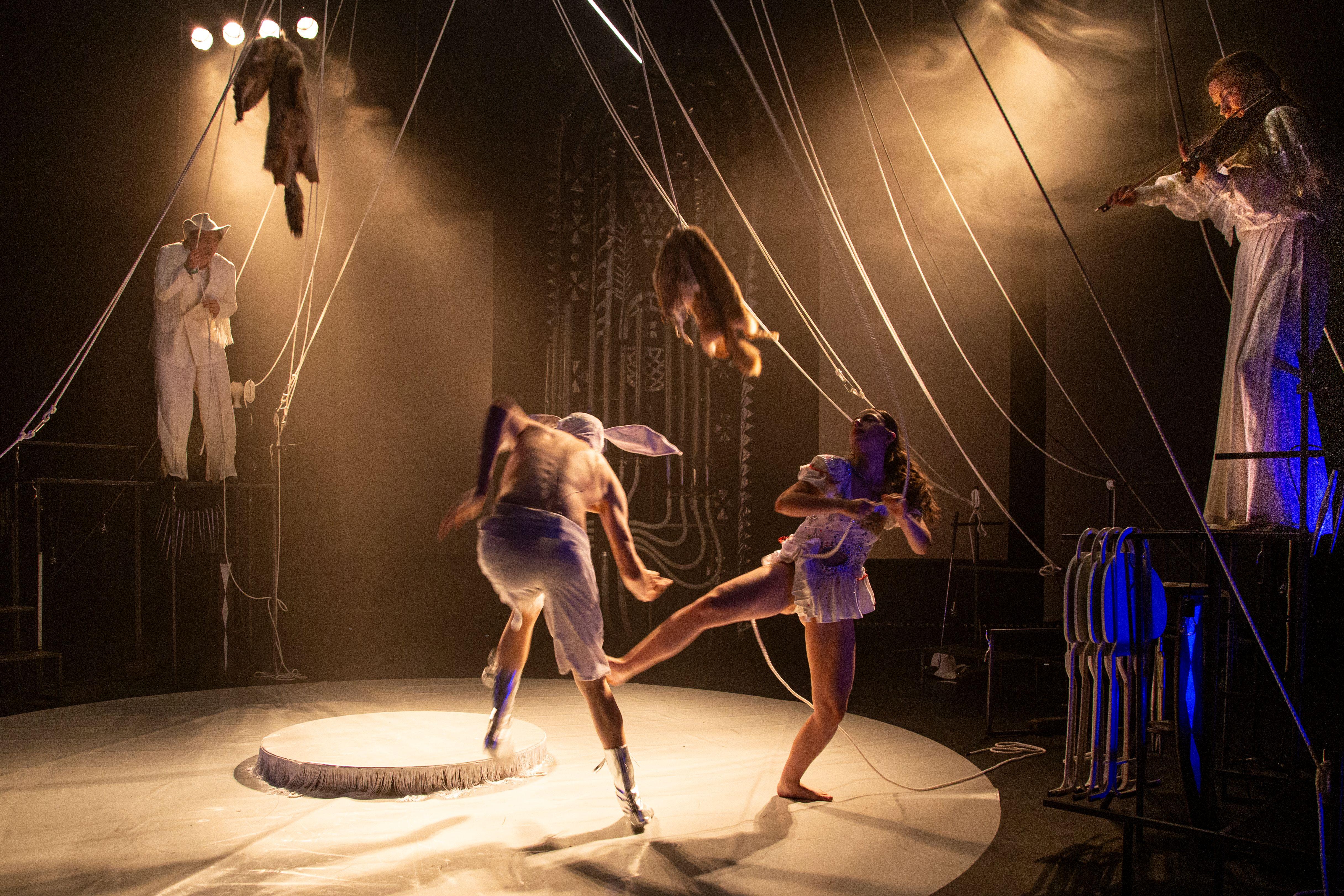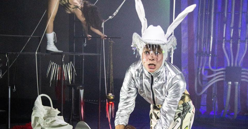 BAM! Met een dreun jaagt Siddiki haar voorstelling uit de startblokken. Je kijkt naar een betoverende scène. Iets dat het midden houdt tussen het orgel in een kerk en een griezelige circuspiste met een witte vloer en zwarte touwen die als een soort dreigende octopus boven de scène hangen.