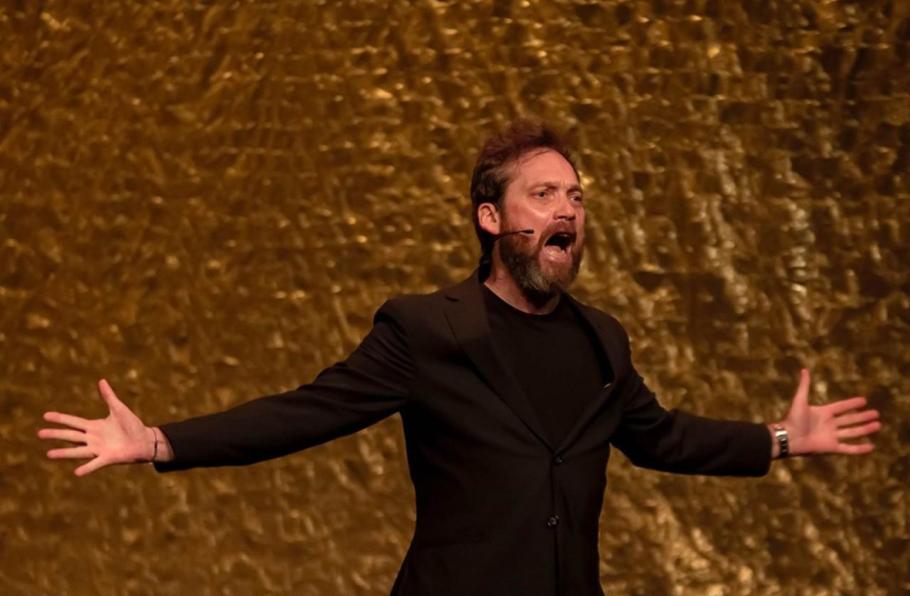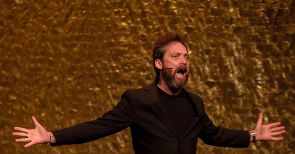Het eerste wat opvalt, is – zoals héél vaak dezer dagen – dat ook deze voorstelling met dreigende muziek begint. Alsof echt elke podiumbeest het wil onderstrepen: ‘Wij leven in dreigende tijden!’ Thomas Smith gooit er vanuit de coulissen nog een hartverscheurende gil achteraan en wandelt dan rustig op. De scène is kaal maar oogt vol. Smith speelt op een vrij smalle strook podium. Twee hoge, goudkleurige achterdoeken treffen elkaar in het midden van de scène en vormen een hoek. Alsof Smith in het hoekje van de kamer is gedrumd. De hoogte van die doeken doen Smith nietig ogen. Maar de gouden kleur geeft hem haast een aura.