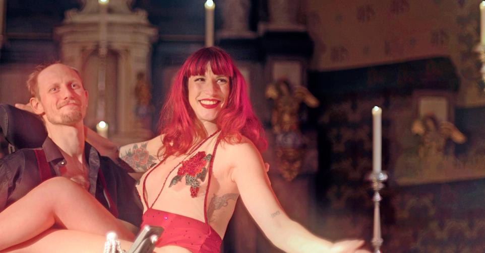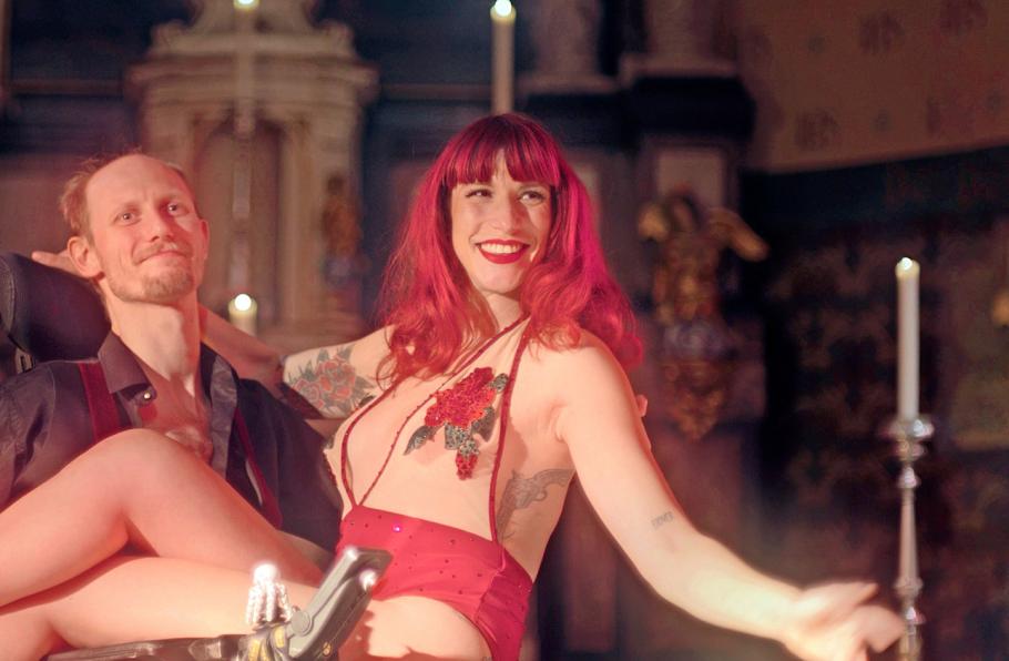 Het klinkt als een sprookje, de burleske danseres en de danser in de rolstoel die samen harten van een wereldwijd publiek willen veroveren. Toen ik Cafmeyer daar zag zitten, met een blauw hemd en een zwarte colbert, moest ik terugdenken aan dat ene programma waar ik als kind zo verslingerd aan was: Het sprookjestheater. De ondertussen overleden Francis Verdoodt leidde met zachte stem het verhaal van de dag in, waarna de kijker samen met de camera in het theater dook en het sprookje tot leven kwam. Zo haakt Cafmeyer nu ook de draden aan elkaar van dit verhaal over twee wonderlijke mensen en hun even wonderlijke vriendschap. Het heeft iets ouderwets, hoe ze daar in het decor zit, even voelt het geforceerd aan, maar al snel heeft het iets vertrouwds en sluit het naadloos aan bij het retrogevoel dat ook de burleske vertoningen uitstralen.